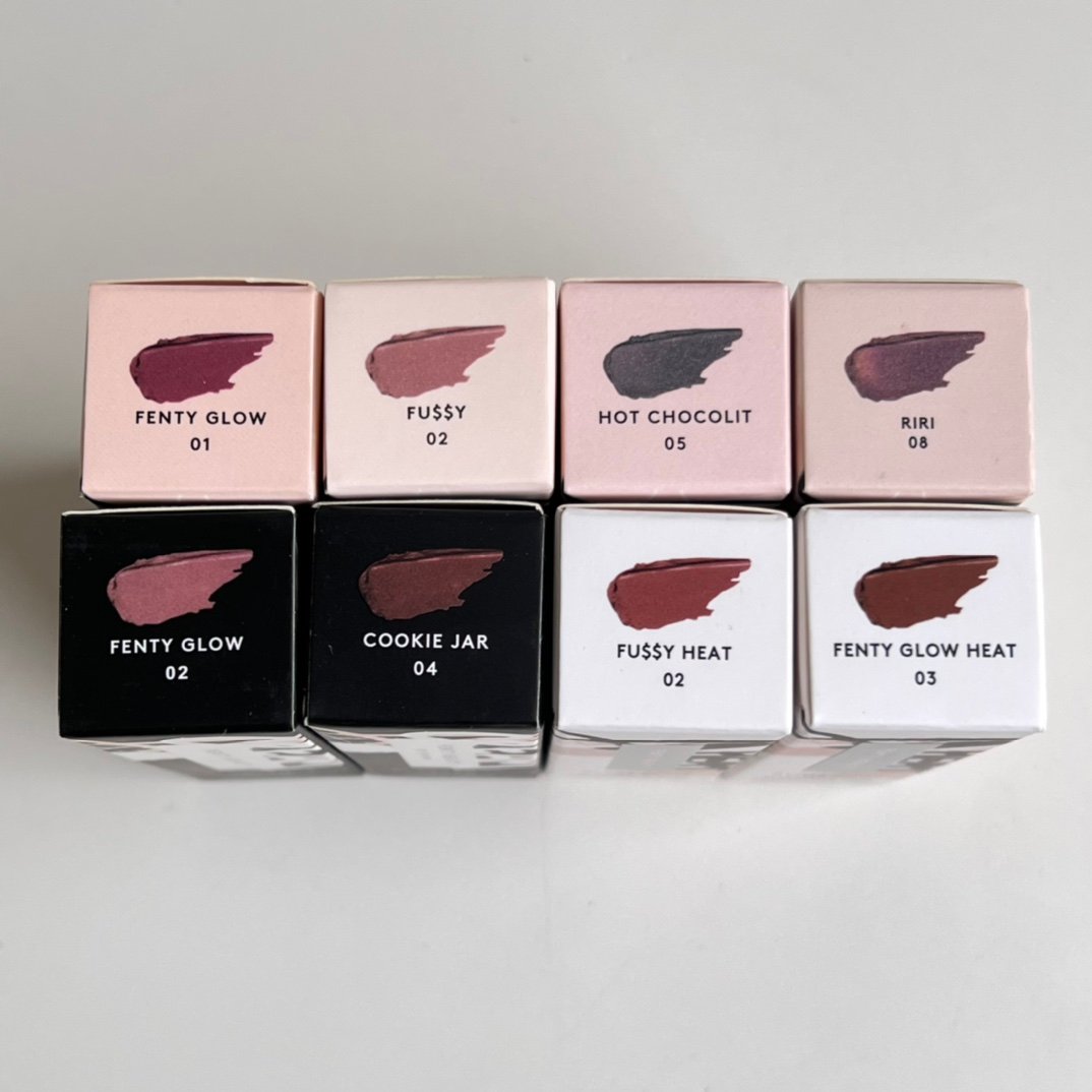 Hot:01# Cherry ,Hot:02#fussy heat ,Hot:03#fenty glow heat ,Hot:04# Chocolit ,Intense color:01# MAUVE WIVE$ ,Intense color:02#fenty glow ,Intense color:03# HONEY WAFFLES ,Intense color:04# cookie jar ,Intense color:05# FRUIT SNACKZ ,streamer:01#fenty glow ,streamer:02#fussy ,streamer:04# Sweet Mouth ,streamer:05#hot chocolit ,streamer:08#RiRi ,streamer:12# Fuchsia flex |